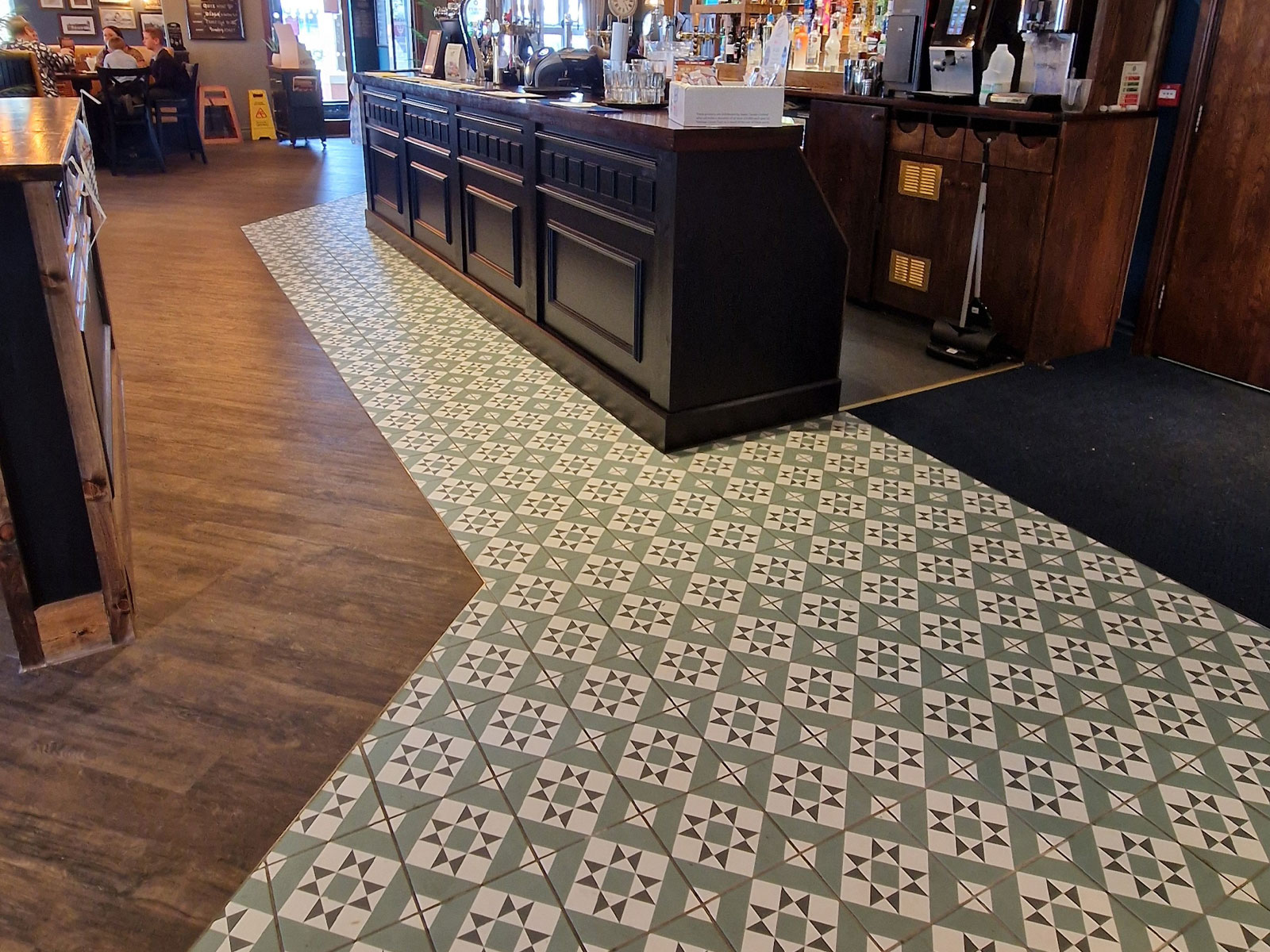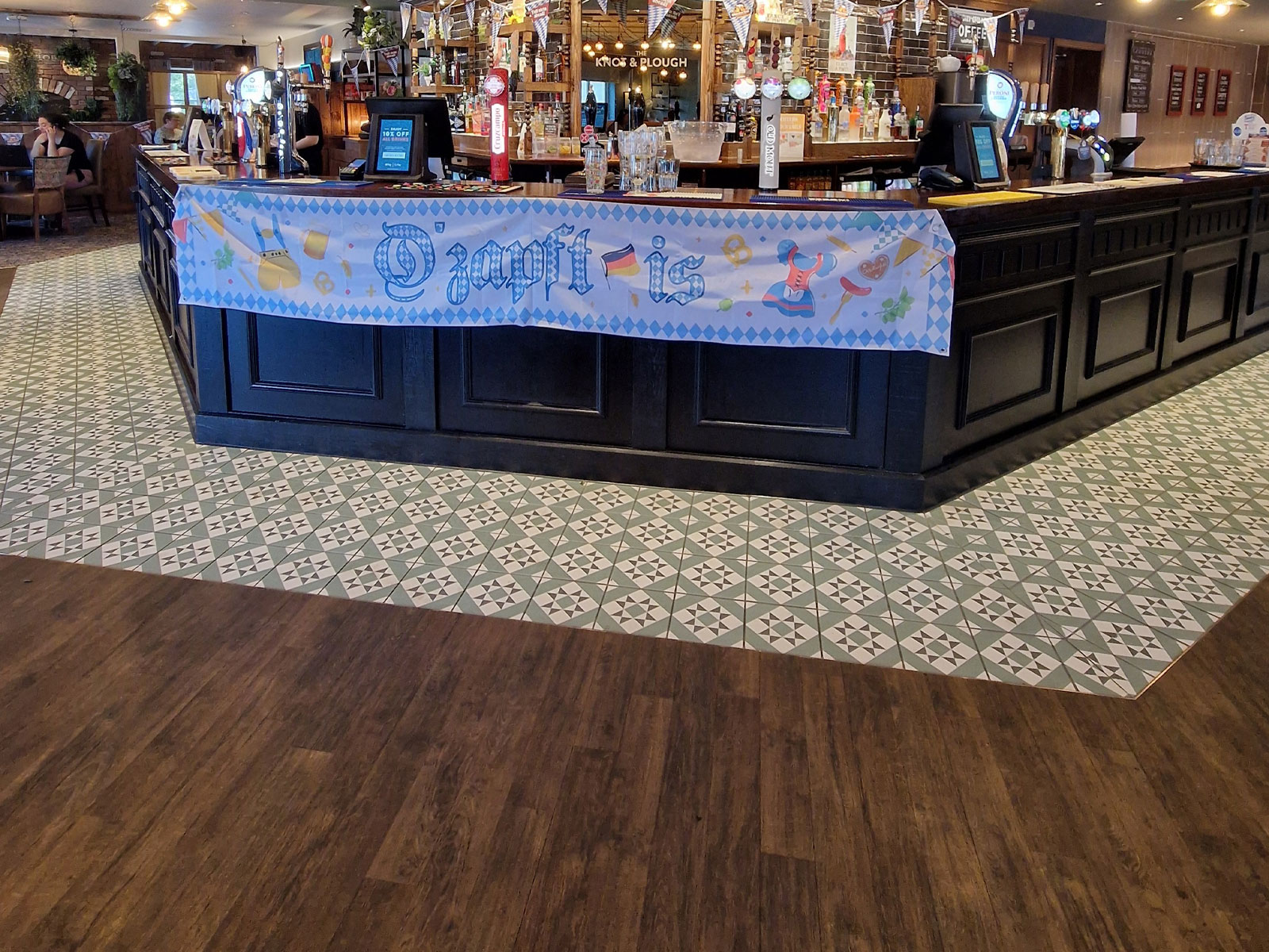 Working in collaboration with Birmingham hospitality designers Newman Gauge, Verona Architectural Tiles supplied the on-trend geometric anti-slip floor tile finish. Installed in the bar and servery circulation areas, anti-slip porcelain tiles are the perfect choice for their durability, ease of maintenance and design aesthetic.